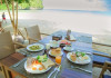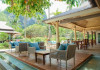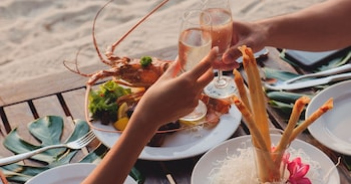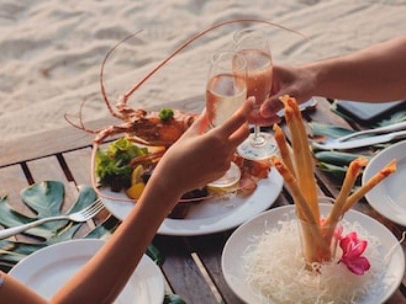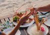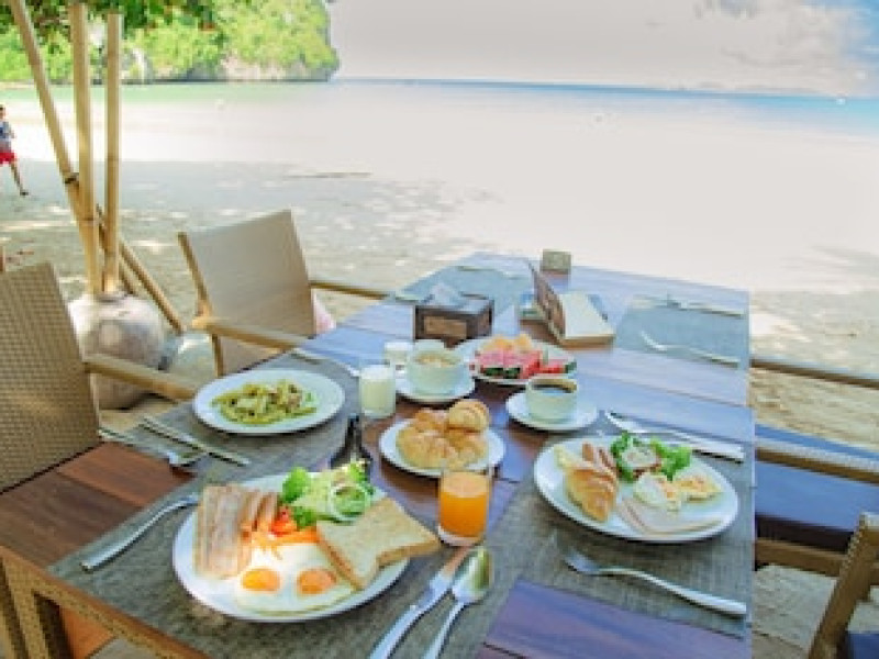 Restaurantul de pe plajă al complexului Railay Village servește fructe de mare proaspete la grătar alături de mâncăruri tailandeze și internaționale, având ca fundal apusul de soare auriu și sunetul plajei.