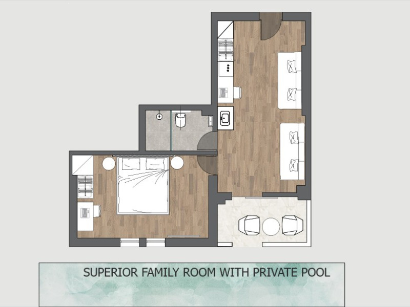 Camera de familie, superioara, piscina privata: 2 camere separate printr-o usa, piscina privata, papuci si halate de baie, o sticla suplimentara de vin la sosire, o sticla de apa reaprovizionata zilnic, suprafata camerei 30 - 35 m2, camere dupa reconstructie.
