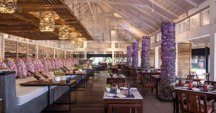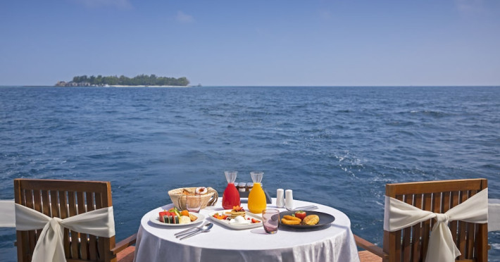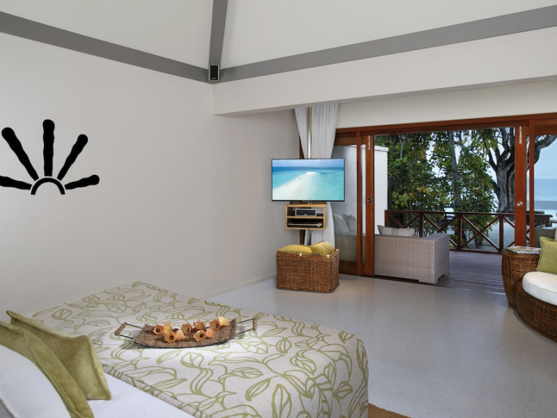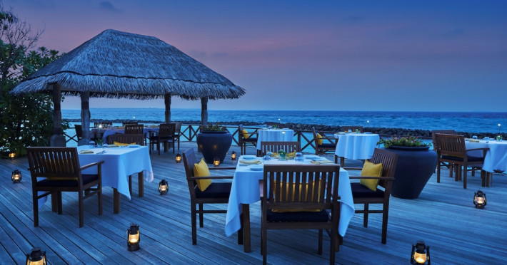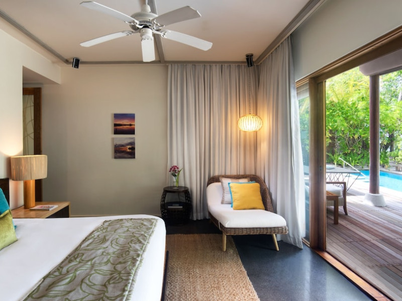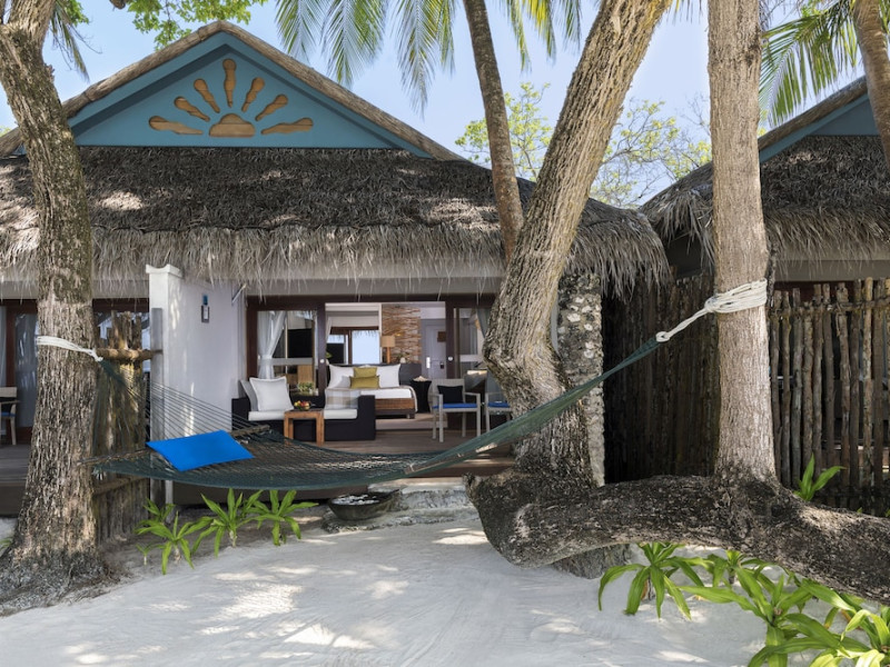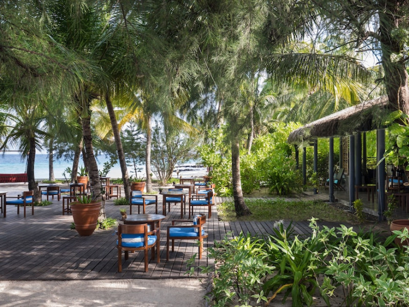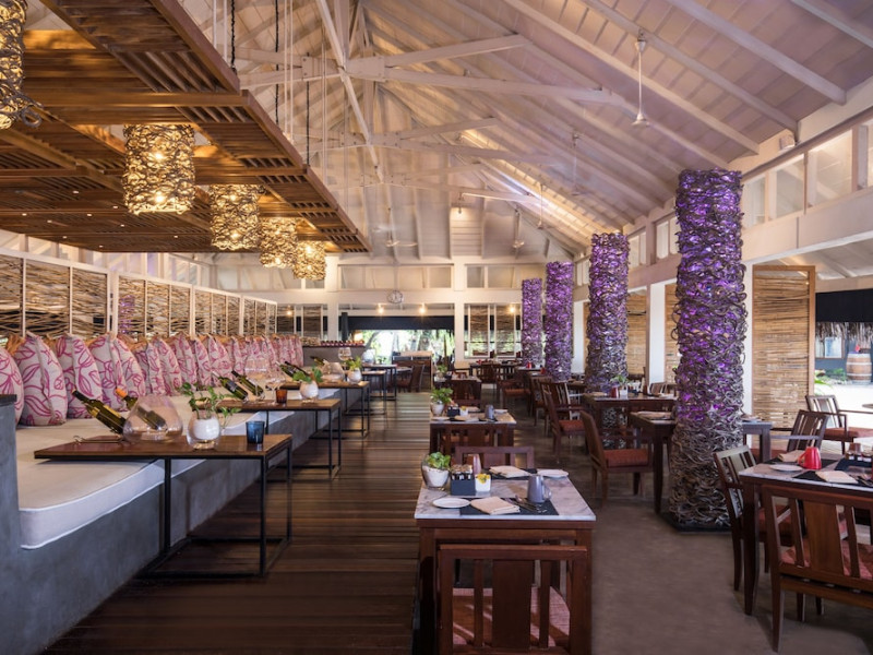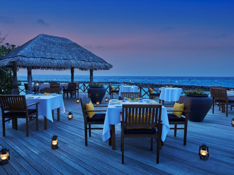 Vivanta by Taj Coral Reef, Maldives, a luxury resort located on Hembadhu Island in the North Malé Atoll, offers stylish villas with breathtaking ocean views and stunning sunsets. The resort is a 45-minute speedboat ride from Malé Airport. Villas feature 32-inch flat-screen TVs with satellite programming, minibars stocked with organic food and beverages, private patios, and memory foam beds. Amenities include a full-service spa, outdoor pool, steam room, complimentary Wi-Fi, concierge services, a fitness center, a dive school, and an arcade/game room. Dining options include two restaurants (Bokkura and Open - The Grill, offering Pan Asian and Italian/Japanese cuisine respectively), room service (limited hours), and a poolside bar. All-inclusive rates are available, though some restaurants, special dinners, beverages, and amenities may incur extra charges. Nearby beaches include Vabbininfaru Beach (0.7 km) and Angsana Beach (1 km). Water activities such as snorkeling and fish feeding are available, along with island hopping trips. The Taj Coral Reef Resort and Spa is a Beach Resort, Honeymoon, Modern, Resort, Tourist hotel. Located in North Male Atoll area. The nightlife/restaurants are located in the hotel.