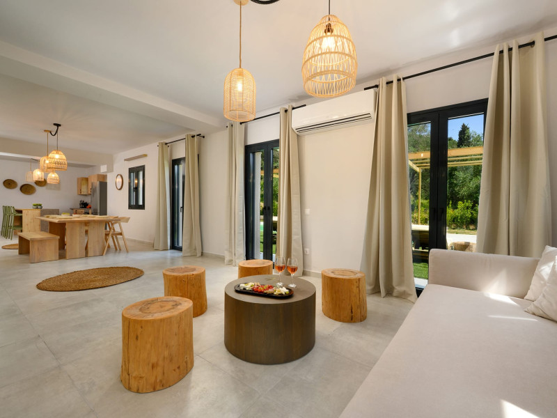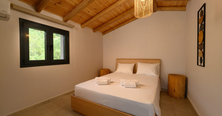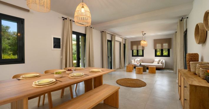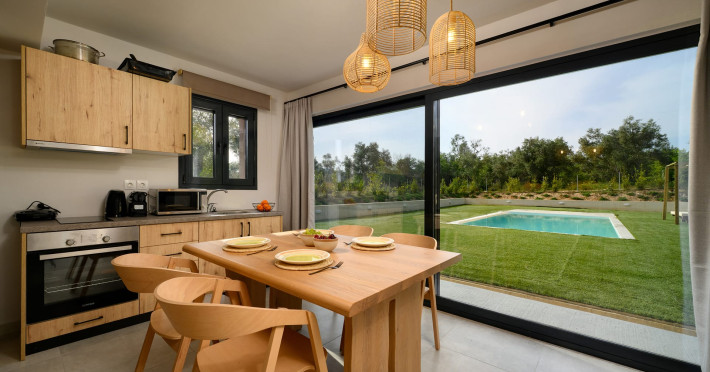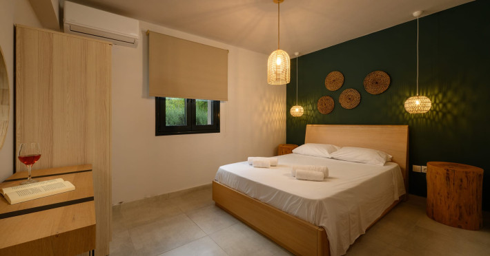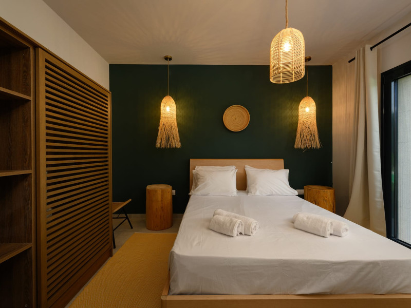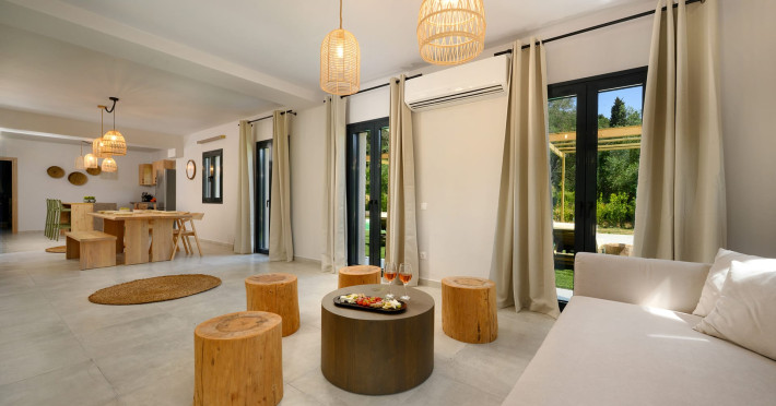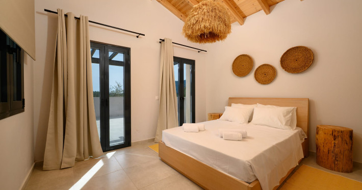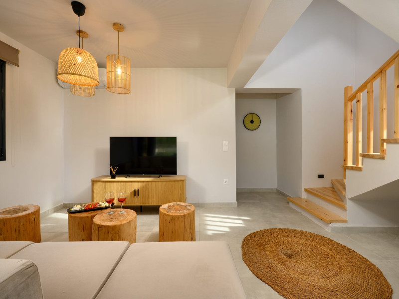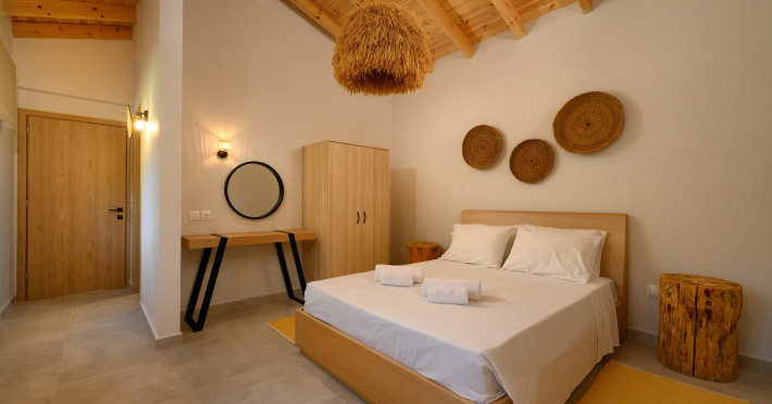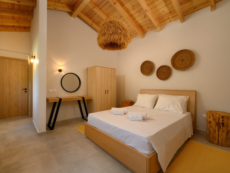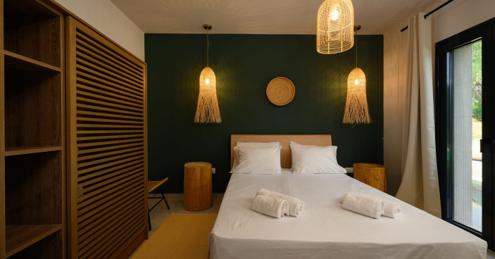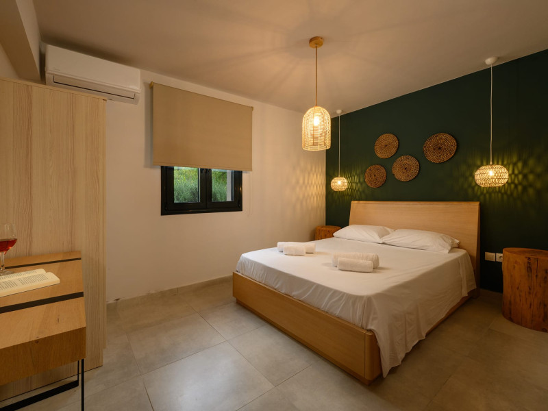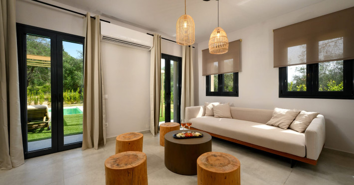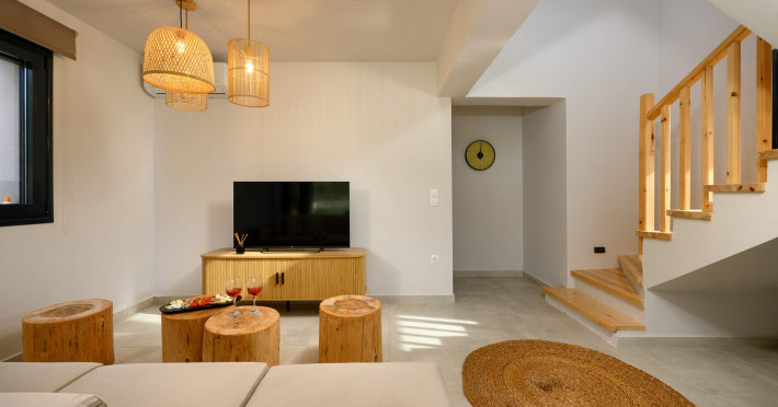 At AEOLINA, sustainability is not just a design choice — it is our responsibility as villa owners. By choosing solid wood furnishings crafted by local artisans, we reduce waste and ensure durability, while natural textures bring harmony with the olive-grove setting. Thoughtful lighting design enhances both comfort and energy efficiency, curated in collaboration with international artist Spiros Gelekas, whose vision blends beauty with mindful living. In every detail, we seek to balance elegance with respect for nature, so that each stay leaves a lighter footprint.