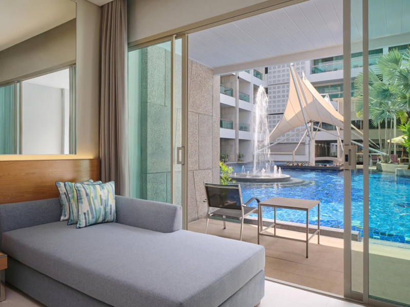 The resort features an outdoor pool, a spa offering massages, body treatments, and facials, a steam room, and a 24-hour fitness center. Additional amenities include complimentary wireless internet access, concierge services, a 24-hour business center, and dry cleaning/laundry services. The resort also offers a tour desk, a shopping plaza, and a wellness clinic.