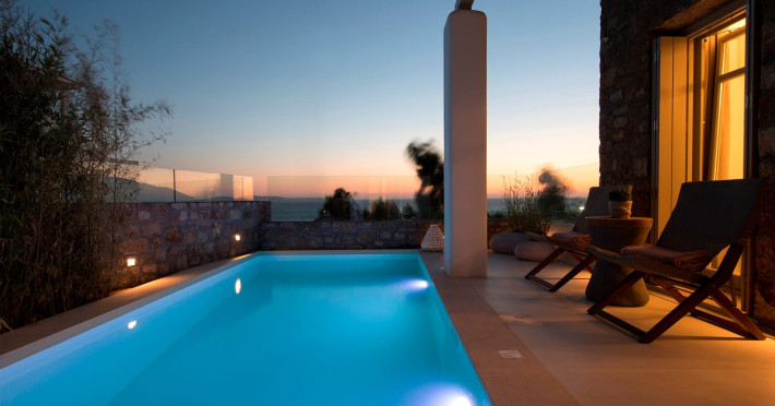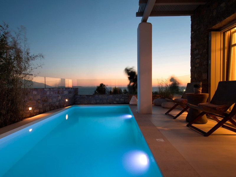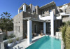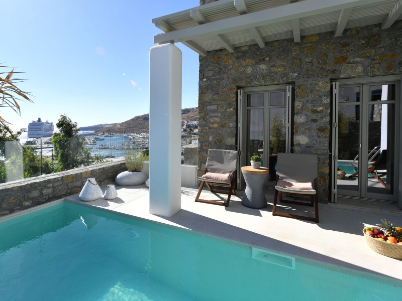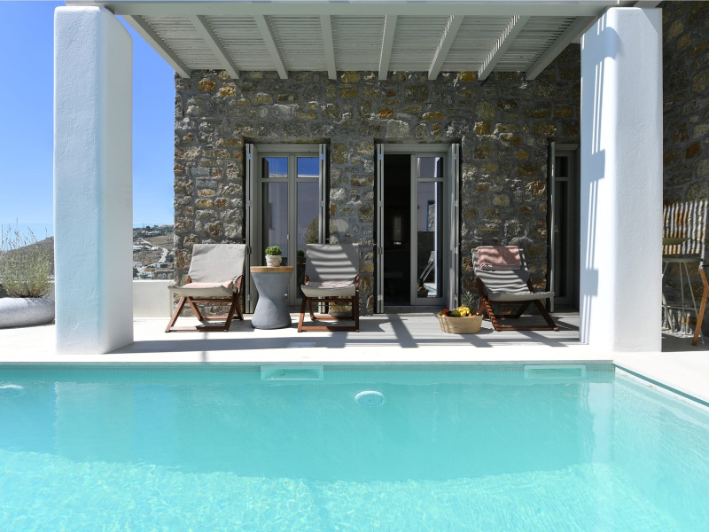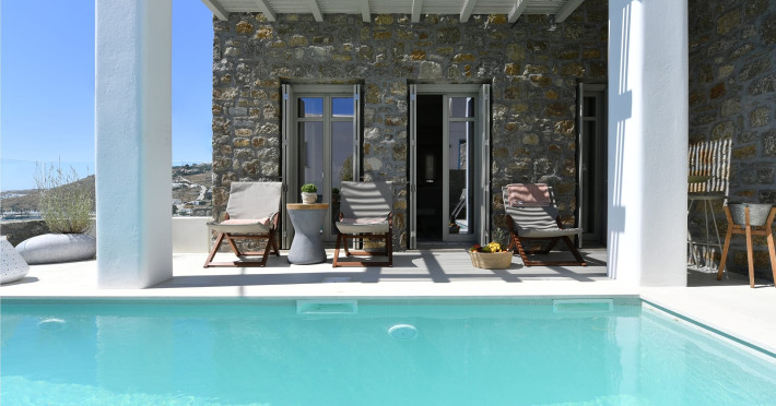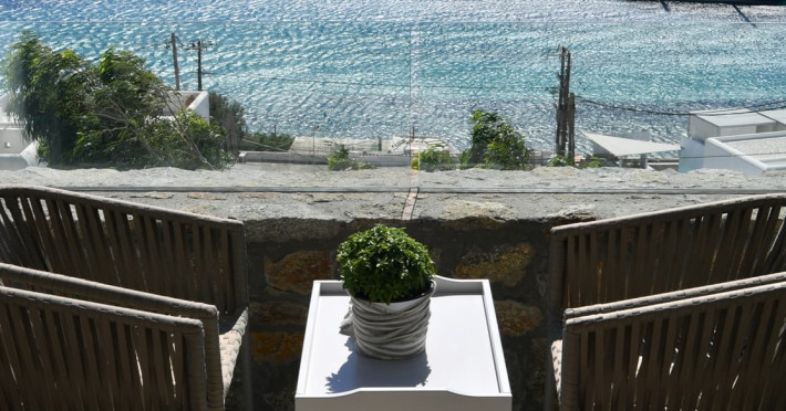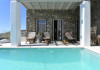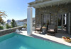 Tourlos Seaview Villa Mykonos is a 300 sq.m. three-level property offering stunning sea views. The ground floor features the main entrance, a fully equipped open-plan kitchen, dining area, living room, and two sea-view double bedrooms with direct access to the private pool. The upper level includes three en-suite bedrooms, including a spacious master suite. The lower level hosts two additional en-suite double bedrooms and a laundry area.