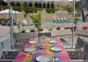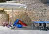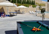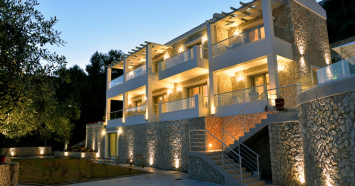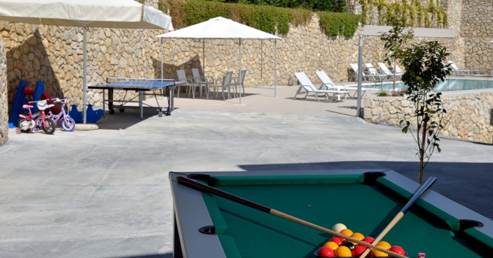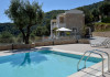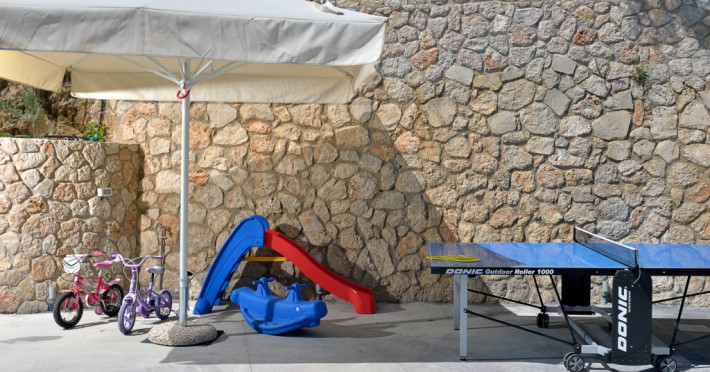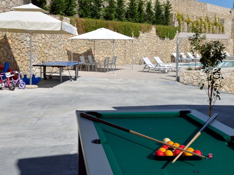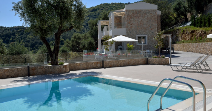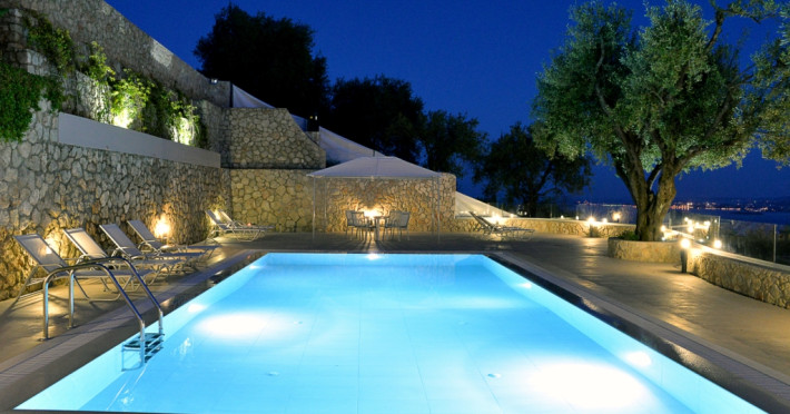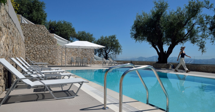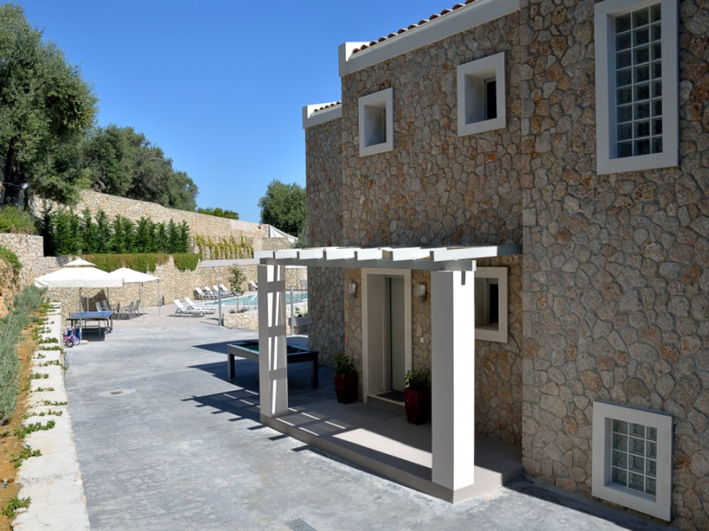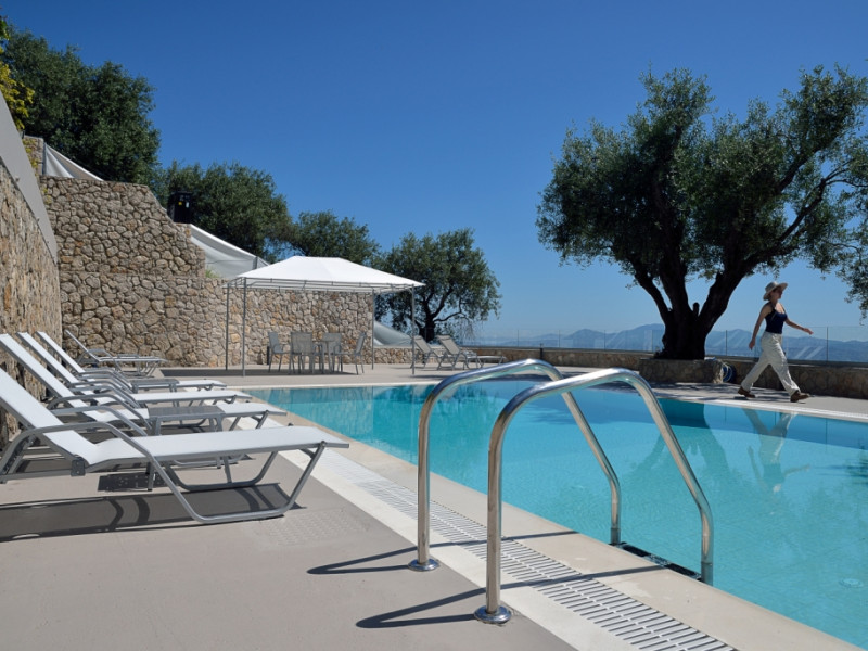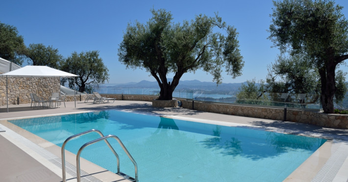 On the upper level, on the right, we find an outdoor dining area, protected by a kiosk. The view over the island and the sea provides the ideal setting for al fresco dinning. A little bit further there is a brick BBQ and a recreation area for all ages. The children can play in the small playground and the grownups can enjoy themselves in the tennis table provided. In the main, 300 square meters area, is the swallow end swimming pool and the sun lounge bar. Two more tables protected by kiosk and plenty sun beds offer you the chance to enjoy a unique feeling. Framed by trees and flowers and bordered by safe glass so as not to obscure the view, the position of the pool area is bound to amaze you. All the magic of Corfu is in front of you. You get the feeling of floating above the island and the sea, and nothing can disturb the sense of serenity that overwhelms you.