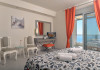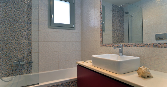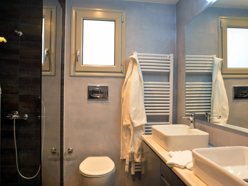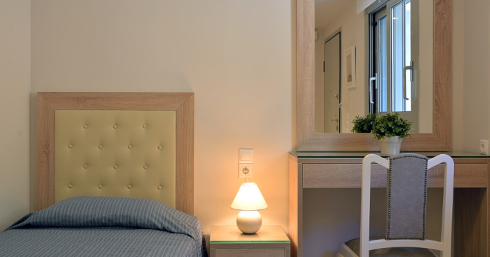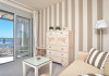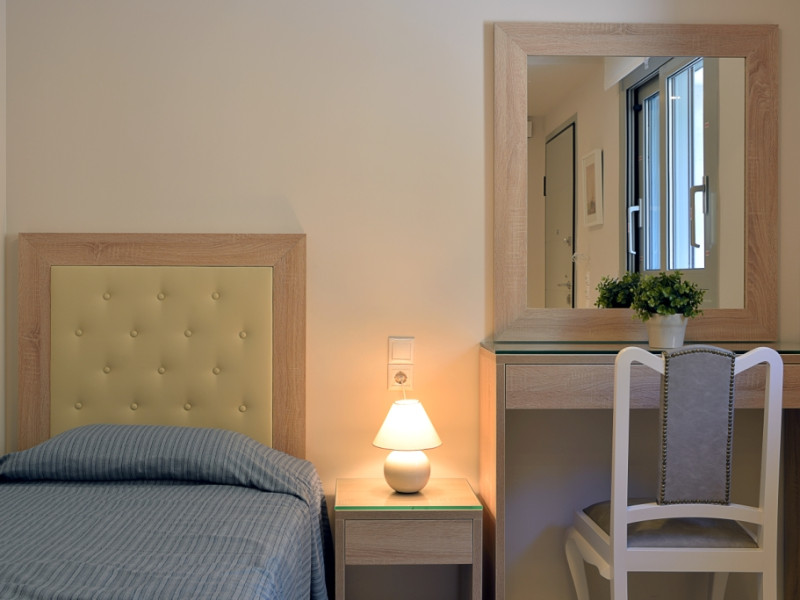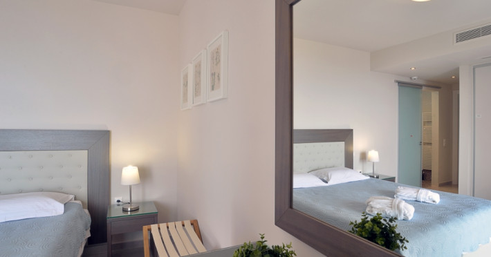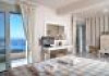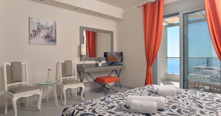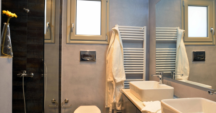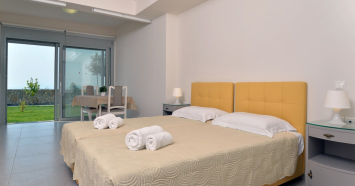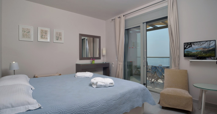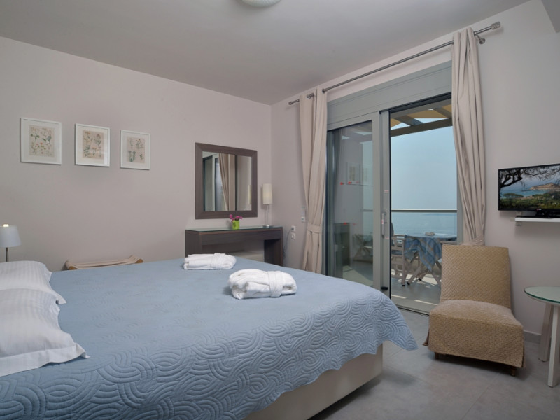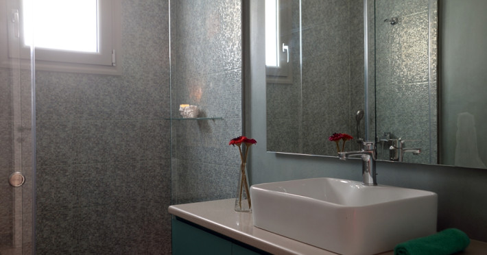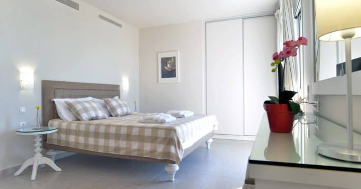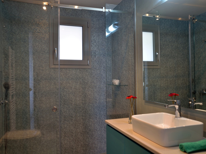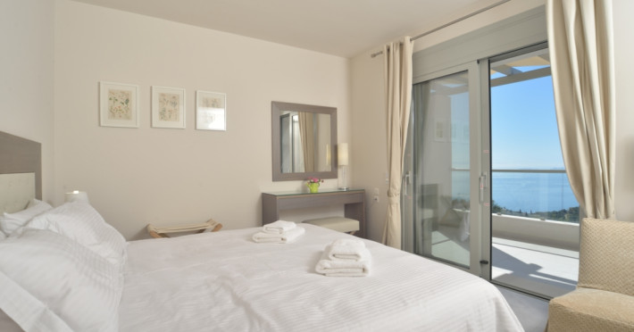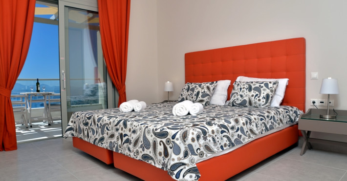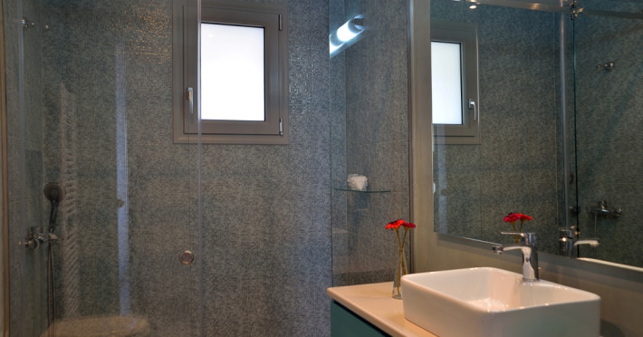 Stairs to the first floor lead to three individually styled and furnished bedrooms, each with access to a balcony with a breathtaking view. The rooms are decorated with carefully chosen and renovated antique pieces that harmoniously combine with the modern and elegant furniture. The first room you meet is the master bedroom. The room has one king size bed and an area with a sofa that you can seat and relax. Two balcony doors allow the light and the view to feel the room and give access to the large balcony. All balconies are framed with safe glass so as not to obscure the view. Continuing, we find a spacious, modern shower room with double washbasins and all the amenities needed. The one twin bedroom with the en suite bathroom is at the end of the hallway whilst on the other side of the hallway we find the other twin bedroom with the en suite shower room. All the rooms have access to balconies. The decoration with its eclectic artwork and fresh colours provide a feeling of pleasure and serenity while the facilities and the ample spaces provide all the comfort you need.