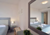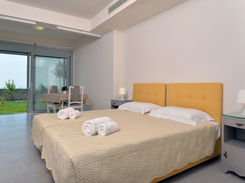 The ground floor of the villa features an ample living room with an open, modern and well – equipped kitchen and a spacious dining area. The living features two different spots for relaxation with modern, comfortable sofas while there is a great dinning table from which you can enjoy your meals with the view of Corfu that reaches Paxos Island. In this floor is one single bedroom and a spacious shower room which both meet all the regulations for people with disabilities. The patios and balconies surrounding the floor give a fantastic view of the garden and the amazing view the property has to offer.