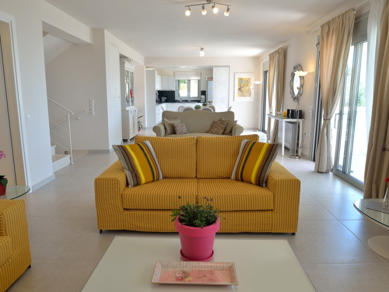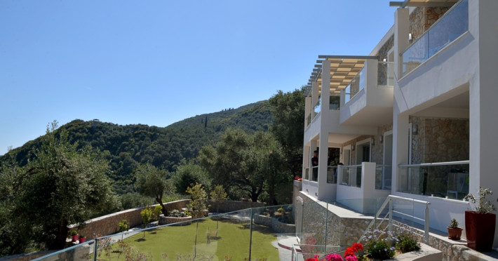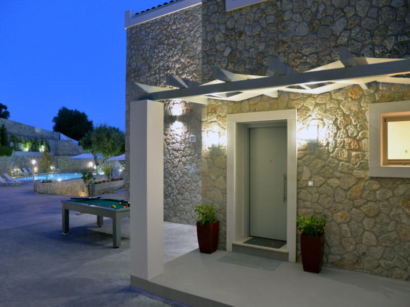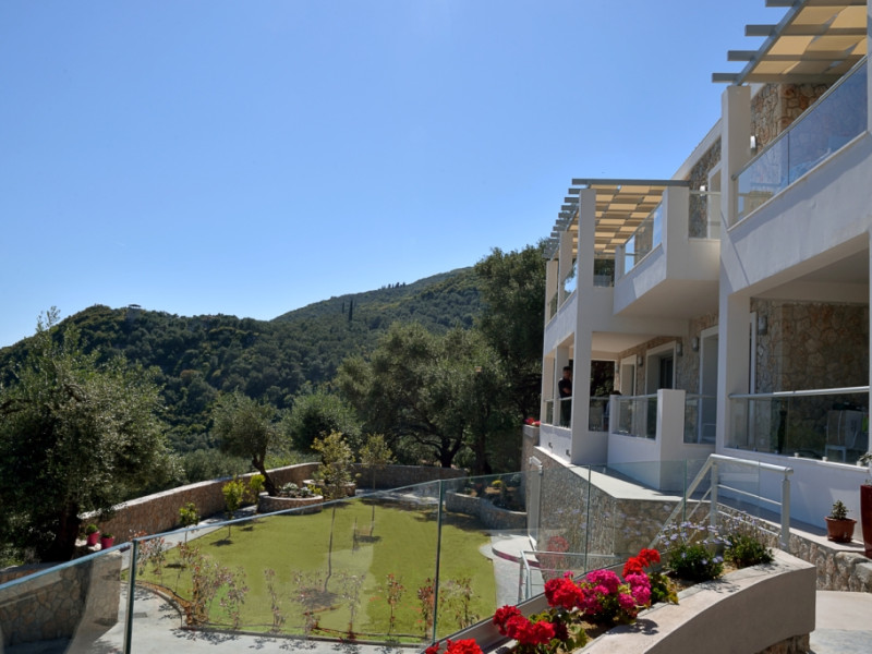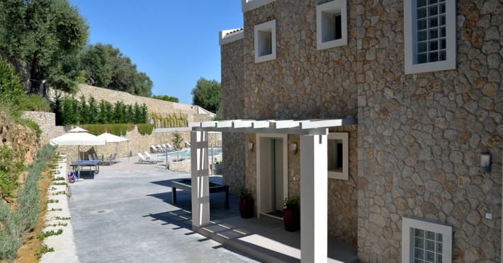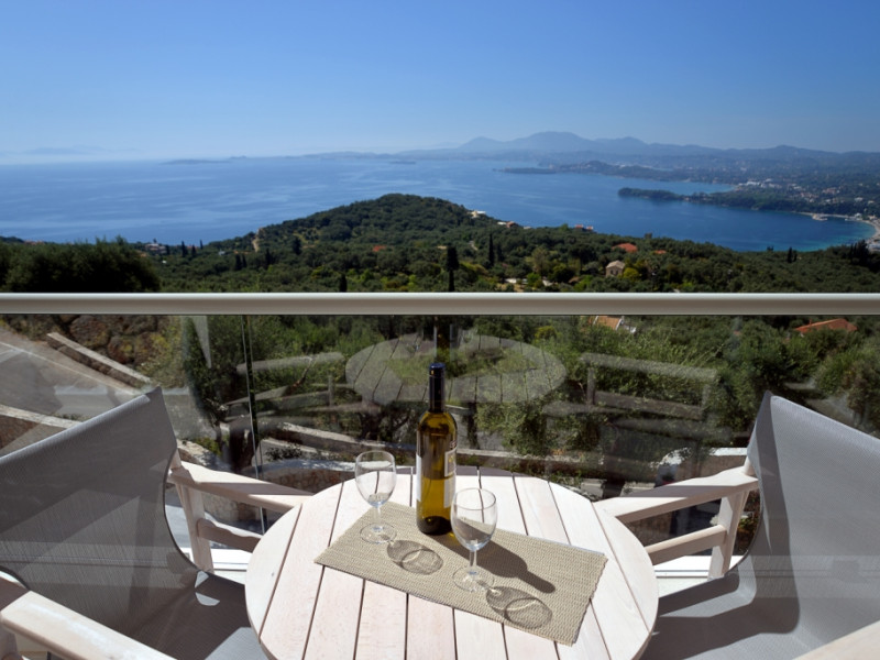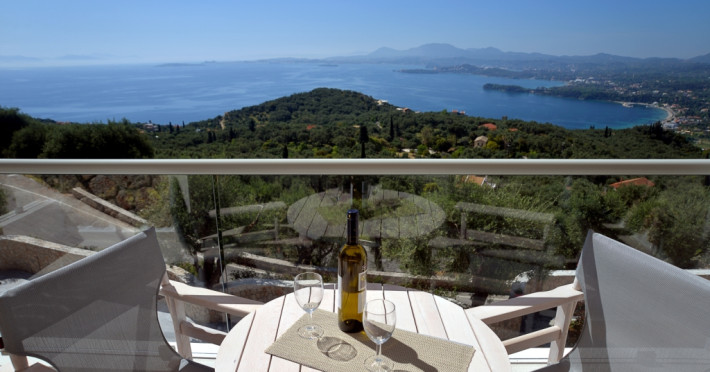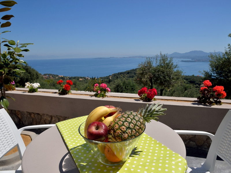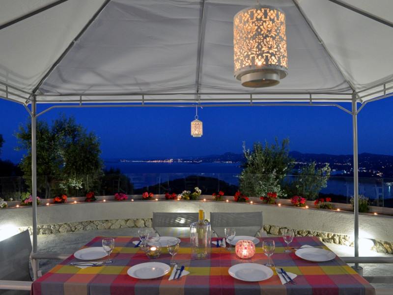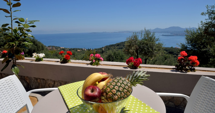 A private gated highway leads to the villa Athiri where we find a large outdoor area split in two levels. On the left is the garden with the lawn and some beautiful trees and flowers. The patio furniture there gives you the opportunity to enjoy an unbelievable view. The eye wanders to the Ionian Sea, and to Ipsos, Dasia and the inland villages. The little islands of Lazaretto and Vidos catch your attention and a little further the old town of Corfu where you can spot both the fortresses. The view continues till South Corfu and on a clear day it reaches the island of Paxos.