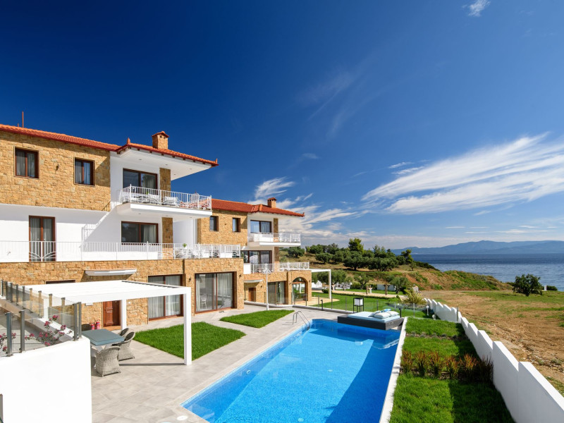 General description:The hotel Villa D' Oro Luxury Villas and Suites is located approx. 150 m from a stone beach. At the beach are sun umbrellas and sun loungers free of charge available. The town Thessaloniki is around 110 km away. The nearest shopping facilities are located approx. 12 km from the hotel, a supermarket can be reached after around 5 km. For evening dancing you will find a nightclub in a distance of approx. 10 km. For mobility during your holiday, there are a bus stop (approx. 6 km away) and a car rental company. For medical treatment in emergencies there is a hospital around 32 km away. The airport (SKG) is approx. 115 km away. Amenities:The 3-storey suitehotel has 22 rooms, and spread over one main building and 6 adjoining buildings. It offers its guests a reception (check-in from 15:00, check-out until 11:00), air conditioning, a safe (for free) and a free parking area. For the meals, there is a snack bar. You can relax in good company in the hotel bar. WiFi is available for free. For guests dependent on a wheelchair the hotel has a barrier-free access. Room cleaning and room service are free of charge. Pool:In the outdoor area of the modern hotel you will find one fresh water pool. Here, there are sun loungers and sun umbrellas for free available. At the pool bar you can get refreshing beverages. Meals:Continental breakfast. Sport and Leisure:Massages available for a fee. Additional information:Additional fees may apply for certain facilities, amenities or activities. Some services depend on the local climatic conditions and the season. Languages spoken: English, German and Greek. Accepted methods of payment: Euro / MasterCard and Visa. JuniorSuite (SeaView, Terrace):With double bed, sofa bed as extra bed, baby cot (for free), kitchenette, balcony or terrace, kettle (for free), internet (for free), safe (for free) and flat screen sat TV as well as individually adjustable air conditioning. Bathroom with shower (room size: 45 - 54 m). Loft Suite (SeaView, Private-PoolTerrace):With king size bed, sofa bed as extra bed, baby cot (for free), kitchenette, private pool, balcony or terrace, kettle (for free), internet (for free), safe (for free) and flat screen sat TV as well as individually adjustable air conditioning. Bathroom with shower (room size: 55 m). Elegance Suite (SeaView):With double bed, sofa bed as extra bed, baby cot (for free), kitchenette, balcony or terrace, kettle (for free), internet (for free), safe (for free) and flat screen sat TV as well as individually adjustable air conditioning. Bathroom with shower (room size: 79 m). Premium Suite (SeaView, Private-PoolTerrace):With king size bed, sofa bed as extra bed, baby cot (for free), kitchenette, private pool, balcony or terrace, kettle (for free), internet (for free), safe (for free) and flat screen sat TV as well as individually adjustable air conditioning. Bathroom with shower (room size: 79 m). Select Suite (SeaView, Private-PoolTerrace):With king size bed, sofa bed as extra bed, baby cot (for free), kitchenette, private pool, balcony or terrace, kettle (for free), internet (for free), safe (for free) and flat screen sat TV as well as individually adjustable air conditioning. Bathroom with shower (room size: 55 m).