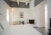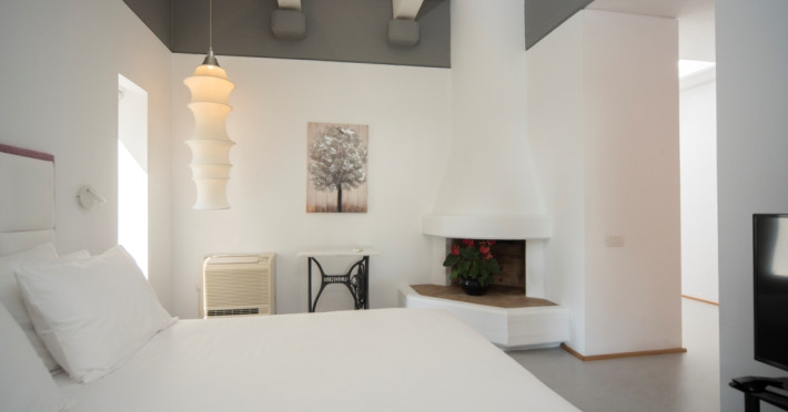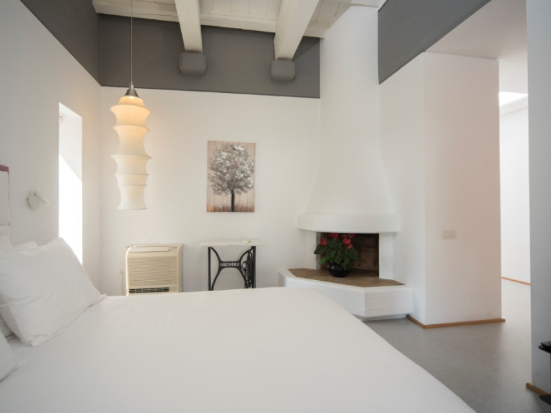 with luxury white bedding, fireplace, A/C, smart satellite TV, ensuite bathroom