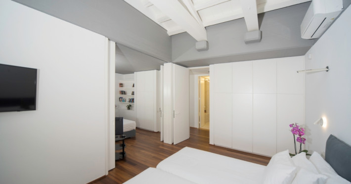 toiletries. Adjacent to the bedroom, there is an extra bathroom with shower.