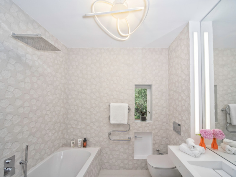 bathtub equipped with rain shower, luxury towels and bathrobes, luxury