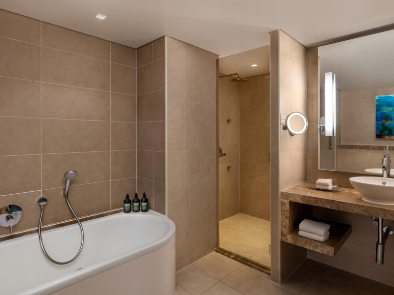Fiecare cameră spațioasă are un televizor cu ecran plat și un pat king-size. Dormitoarele au baie privată și oferă vedere la Golful Arabiei, la terenul de golf Yas Links și la circuitul de Formula 1.