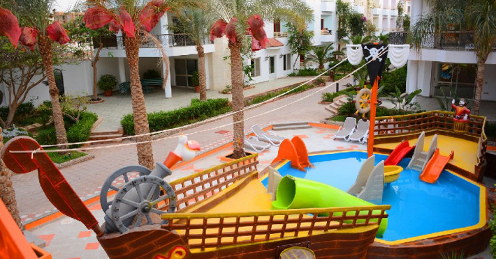 Facilitati copii: Piscina copii cu corabie pirati si tobogane, loc de joaca, animatie pentru copii, meniu copii.
