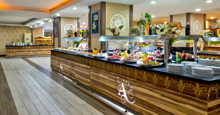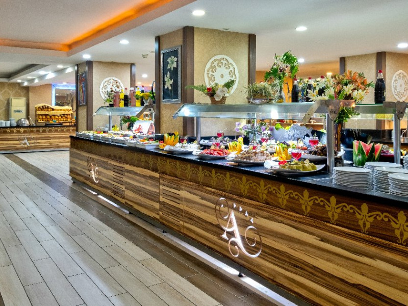 Mese All Inclusive intre orele 10:00 - 23:00, include bauturi alcoolice locale, bauturi racoritoare si bauturi calde (ceai, cafea). Mic dejun: 08:00 - 10:00 Pranz: 12:30 - 14:00 Cina: 19:00 - 21:00 Supa de noapte: 23:00 - 24:00 Mic dejun tarziu si supa: 24:00 - 06:00 Mesele sunt servite sub forma de bufet in restaurantul principal. Baruri: Pool Bar: 10:00 - 23:00 Lobby Bar: 10:00 - 24:00 Beach Bar: 10:00 - 18:00 (gustari 11:00 - 16:00) Servicii suplimentare: Gozleme 11:30 - 16:00 la barul de la piscina Cafea 14:30 - 18:00 la cofetarie Wafe 15:00 - 17:00 la cofetarie Inghetata 15:00 - 17:00 la cofetarie Informatii suplimentare: Bauturile importate, imbuteliate, sucurile proaspat stoarse, unele tipuri de cafea, cafeaua turceasca si anumite bauturi alcoolice contra cost.