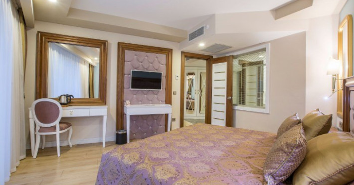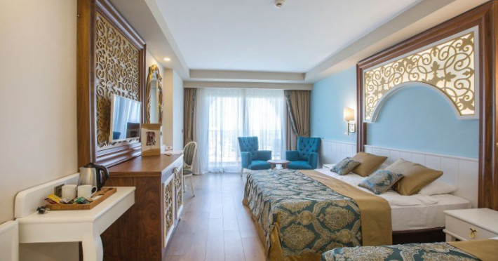 Dotari camere: Camerele hotelului sunt dotate cu: telefon, TV, seif (contra cost), minibar, aer conditionat, baie cu cabina de dus, uscator de par, balcon, internet wi-fi. Facilitati generale HOTEL JADORE DELUXE: Hotelul ofera oaspetilor sai multiple facilitati: restaurant principal, 4 restaurante a la carte, 7 baruri, patiserie, cafenea, 2 piscine exterioare, piscina interioara, piscina exterioara pentru copii, aquapark, programe de animatie, muzica live, discoteca, centru spa, baie turceasca, centru fitness, tenis de masa, darts, volei pe plaja, aerobic, yoga, mini golf, camera de bagaje, internet wi-fi, sali de conferinta. Servicii cu plata: restaurantele a la carte, fresh-uri din fructe, seif, sporturile de apa (navigatie, sporturi motorizate), tratamente in centrul spa, masaj, curatatorie, rent-a-car, babysitting, magazine, coafor, casa de schimb valutar, doctor.