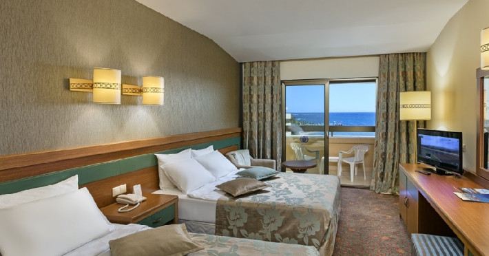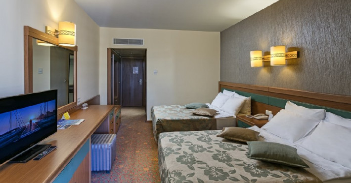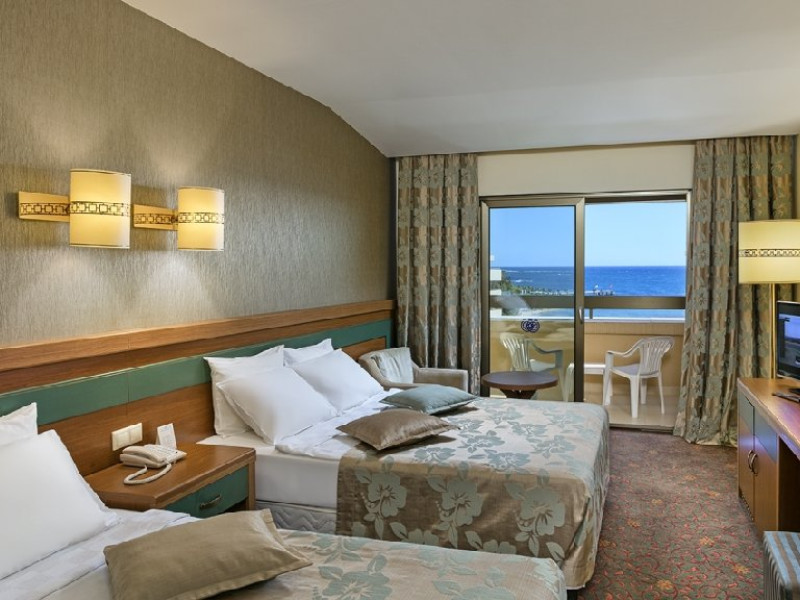 Facilitati hotel: Hotelul pune la dispozitia oaspetilor: restaurant, restaurant a la carte, snack-bar, mai multe baruri inclusiv la piscina, 3 piscine exterioare (dintre care una pentru copii), piscina interioara, tobogane de apa, centru Spa, sala fitness, spectacole si muzica live, volei pe plaja, tenis de masa, darts, water polo, aerobic, miniclub.