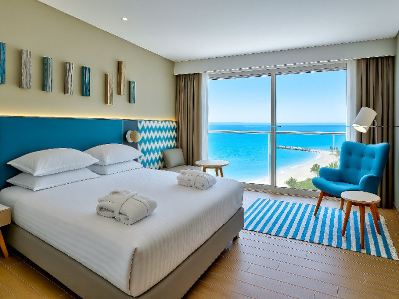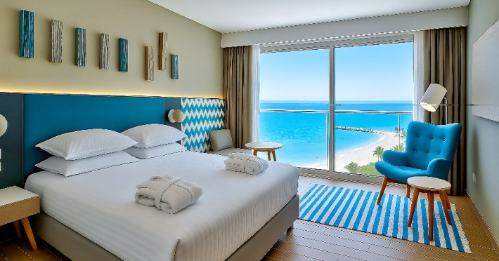 Camere standard cu vedere la oras (24 mp), camere superior cu vedere partiala la mare (24 mp), camere exclusive cu vedere frontala la mare (65 mp), camere exclusive cu vedere partiala la mare (65 mp), camere familiale tip Interconnecting (doua camere standard conectate). Dotari: aer conditionat/incalzire, fierbator electric, minibar (contra cost, la cerere), seif, telefon, TV-sat, balcon/terasa, set pentru calcat, canapea, prosoape, dulap/garderoba.